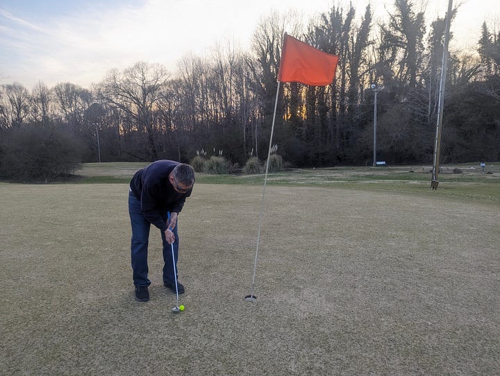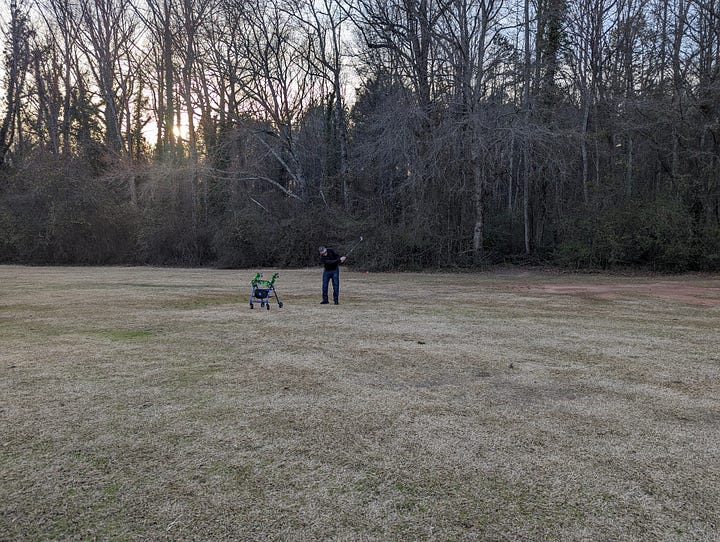 As far as my dad is concerned, he had a pretty good week overall. On Monday it was unseasonably warm and so I suggested we go to a par 3 golf course. Last year when I asked him if he wanted to play he said his back hurt too much and he could not play anymore, it seemed I had played my last round with my dad and I wasn’t even aware of it. Although he couldn’t play, I still thought he would enjoy getting outside and he could putt around on the practice green and watch me play the short 9-hole course. If this went well, my mom and I were considering getting a membership to this course in the Spring as this might be a good activity for him to do to get out of the house. My first shot from the tee box went over the green, and I had quite a bit of trouble putting the ball in the hole, marking an unimpressive “7” on the scorecard. I guess the Masters might have to wait until 2025 after all. Hole #2 did not fare much better, notching a 6 there, it had been several months since I had swung a club and it showed. When I was putting I asked my dad if he wanted to use his walker and walk around the green so he could get some steps in. At the house, he has continued to pace up and down the hall with his walker, and checks his Fitbit each time he sits down to see how many steps he is at for the day. On the back of the cart normally you secure two golf bags, we had one golf bag and one walker. He walked around and looked like he was sad so I asked him what was wrong. “I don’t have my clubs to play,” I told him I didn’t think he could play anymore because of his back, but if he felt good enough I had brought his pitching wedge and putter, intended to be used on the putting green but you could certainly get by with just those clubs on a par 3 course. So on the next hole, after my shot ricocheted off a tree and landed in the fairway, my dad hit his ball off the tee box. It was about half of what a full swing was, but he did it and the ball went straight. We played about 5 holes, with him walking most of them. He was very confused when playing, probably a combination of not playing golf in a while and just the fact of doing something outside his normal routine. He would nearly always forget where his ball was, I would show it to him and he would walk over towards it, walk a few feet past it, put his club on the ground, and take a swing as if there was a ball there, but it was a few feet behind him. I showed him where the ball was again, needing to coach nearly every shot and lead him directly to the ball. Once we got on the green he did a little better in keeping track, but sometimes he would be facing the wrong direction and I would have to remind him where the hole was and he would readjust. He never got upset or frustrated, I don’t think he even realized just how lost he was, as long as he was having fun and not in pain, that was what was important to me, I didn’t care if it took us 15 minutes to do one hole, we would get through it together. After about our 6th hole, he hit a tee shot into the water and declared he was done, the sun was starting to drop along with the temperature so we loaded up back into the van, not before I wiped away a few tears thanking him for coming to play and that I didn’t think I was ever going to play another hole of golf with him before today. “I’m so glad you’re here,” he said, patting me on the leg. This wasn't about achieving a perfect game; it was about the unspoken connection, the shared moments that transcended the scorecard.