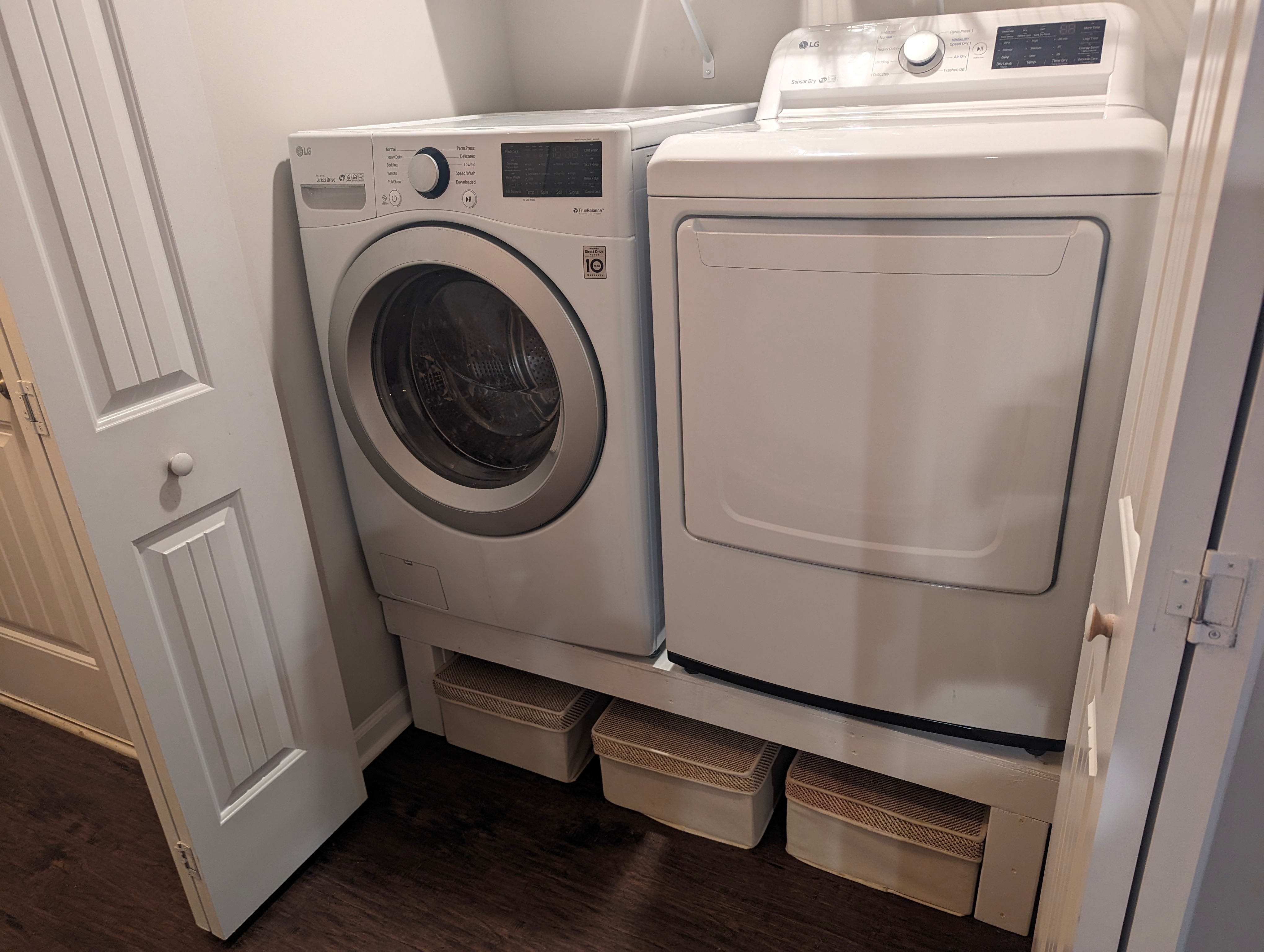 My biggest project of the week was to build an elevated platform for the washer and dryer. This had been a project on the “list” for some time now, and after kicking myself in the pants last week, I decided it was time to get it done. Our washer and dryer are front-loading however they sit on the floor, so when you are using them you have to bend over quite low to use them. You can buy these elevated pedestals to solve this problem, but they are well over $100. After doing some research into different designs, I found one I liked, took the measurements, and went to Lowes to purchase the wood. If you buy wood at Lowes, they will usually cut it for you and I had a list of measurements for what I needed. I had the top piece of plywood cut and then I had 4 2x4s I needed to cut, but the employee informed me they were only allowed to make 4 cuts per customer and I already had two done with my piece of plywood. I do not own a circular saw so getting the pieces cut for me would be a big help in getting this done. I called Home Depot which is across the street and asked about their wood-cutting policy, they said they would be happy to help once I told them I only needed a few 2x4s done so I was able to come back to the house with all the wood cut and ready to assemble. Within a couple of hours, I had the platform assembled and painted, it came out rather well at a perfect height, strong solid design, and space underneath for storage. My mom was very happy with the finished product and so am I.